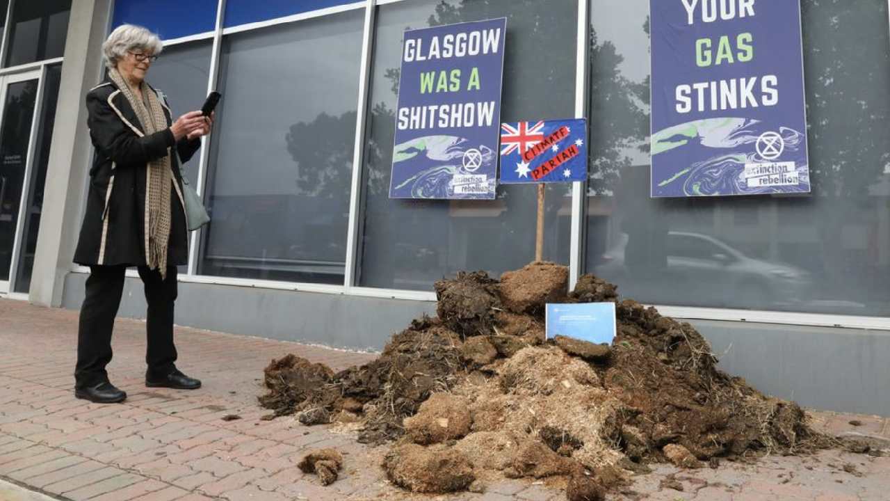 Climate change activists dump a huge pile of poo in front of minister's office in protest