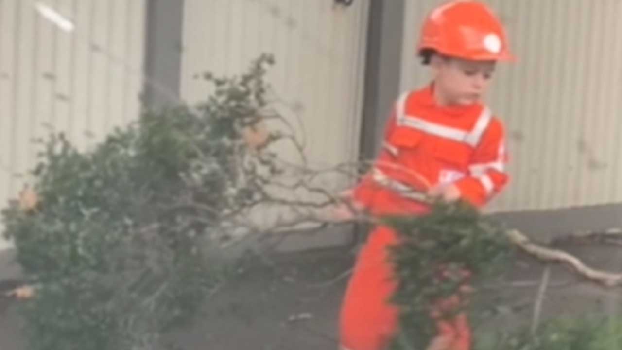 Australia’s tiniest hero gets stuck into storm clean-up