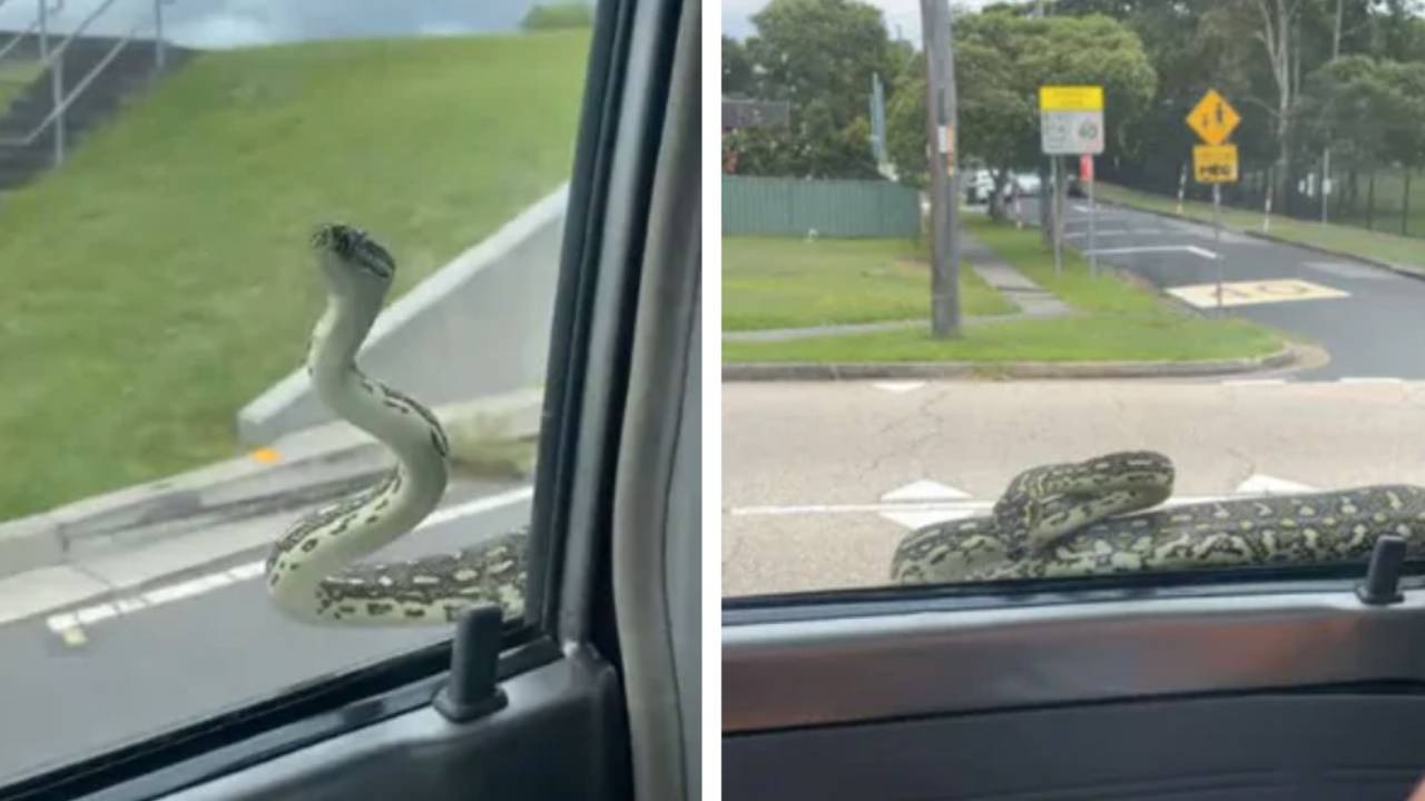 Huge snake hitches a ride on moving car
