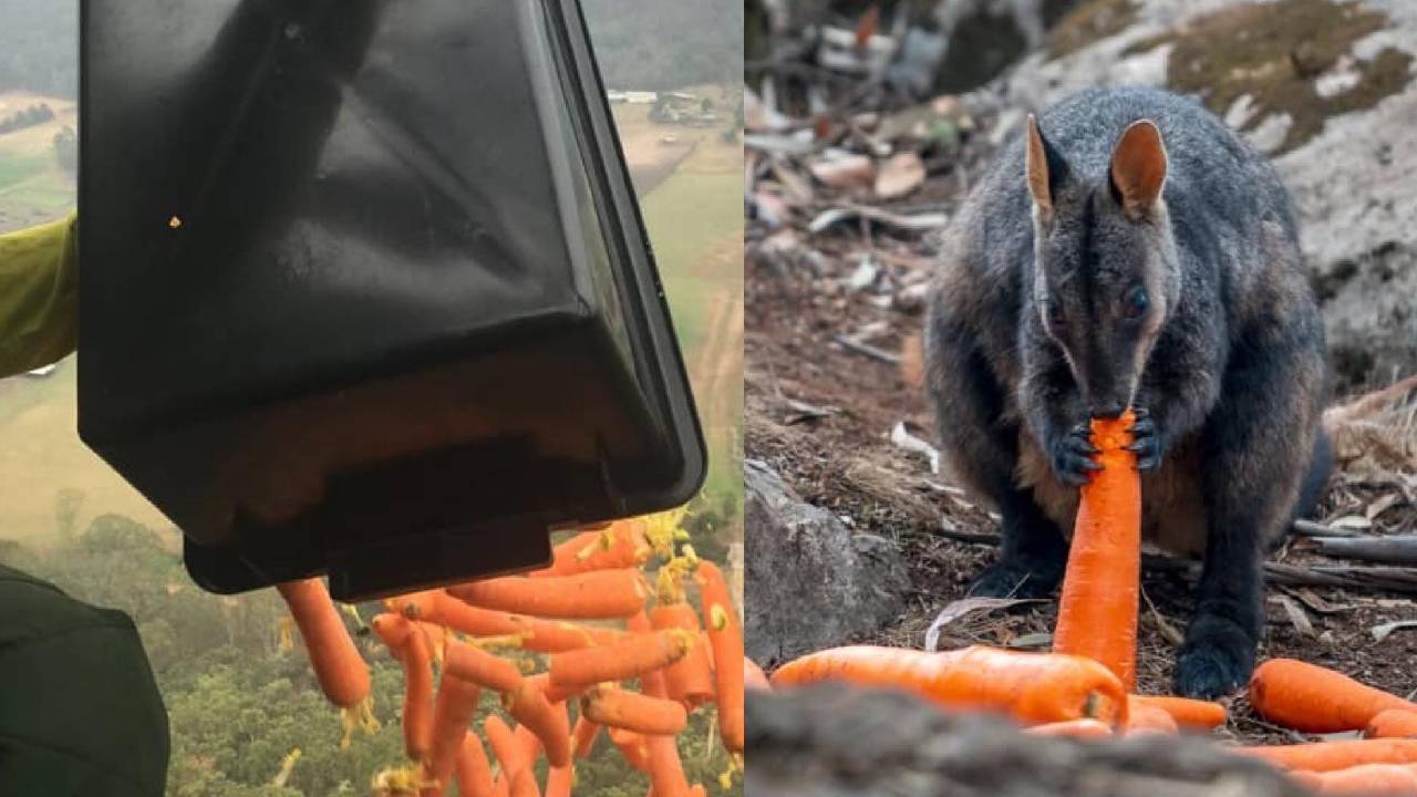Carrots and sweet potatoes dropped from helicopters to feed fire-affected wallabies