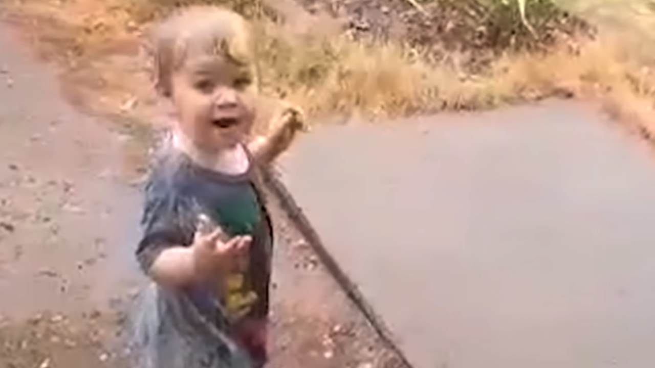 Little boy dances for joy at seeing rain for the first time