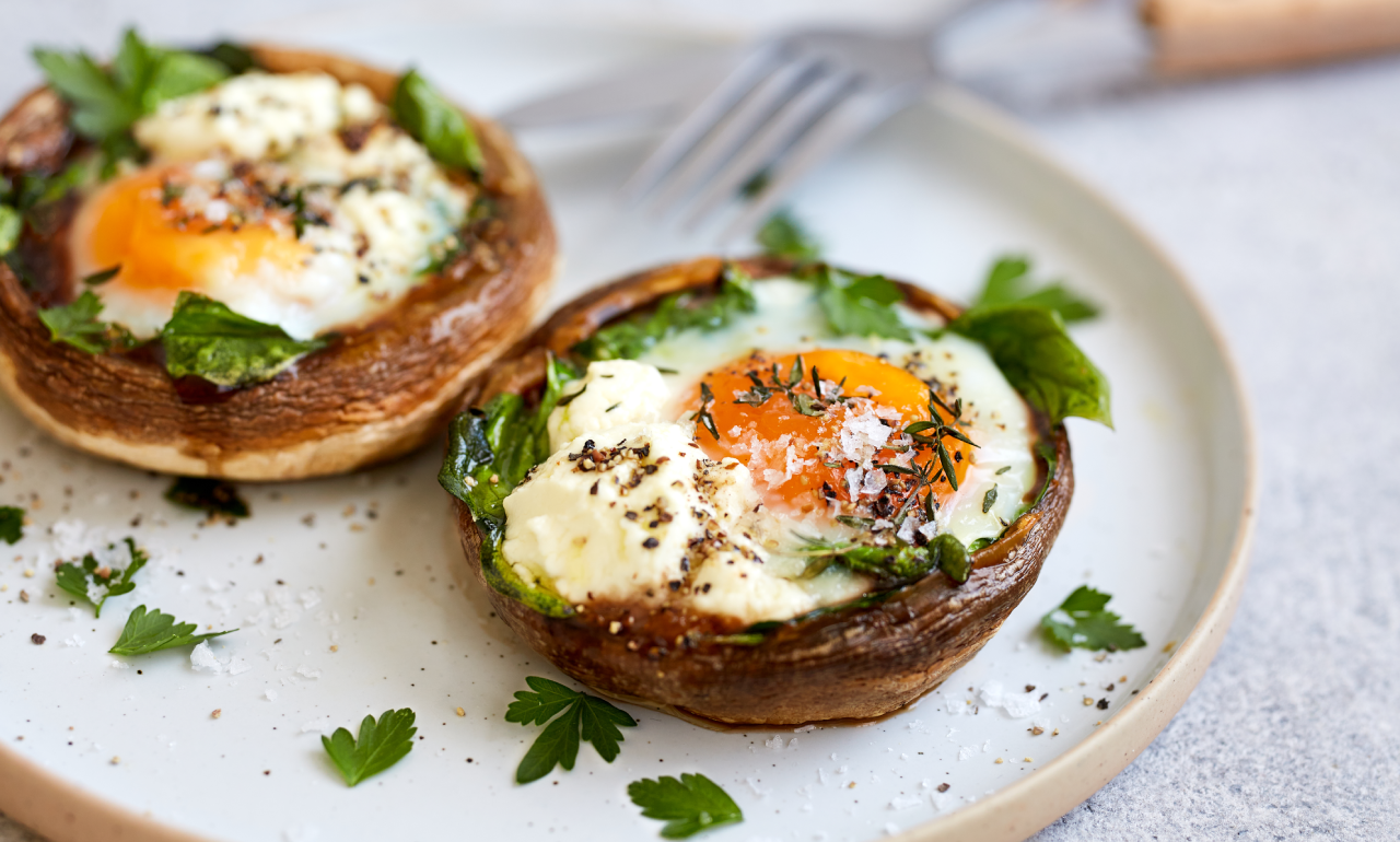 Baked breakfast mushrooms stuffed with spinach, feta and egg
