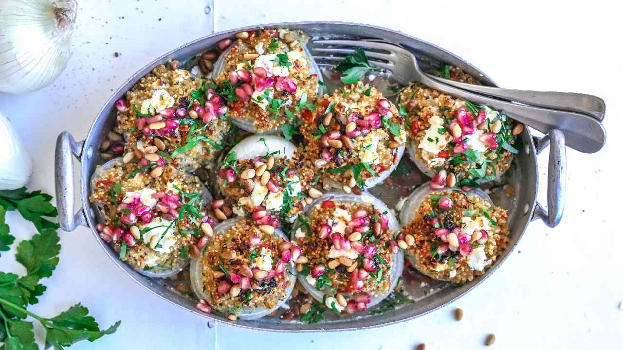 Quinoa pilaf stuffed white onions