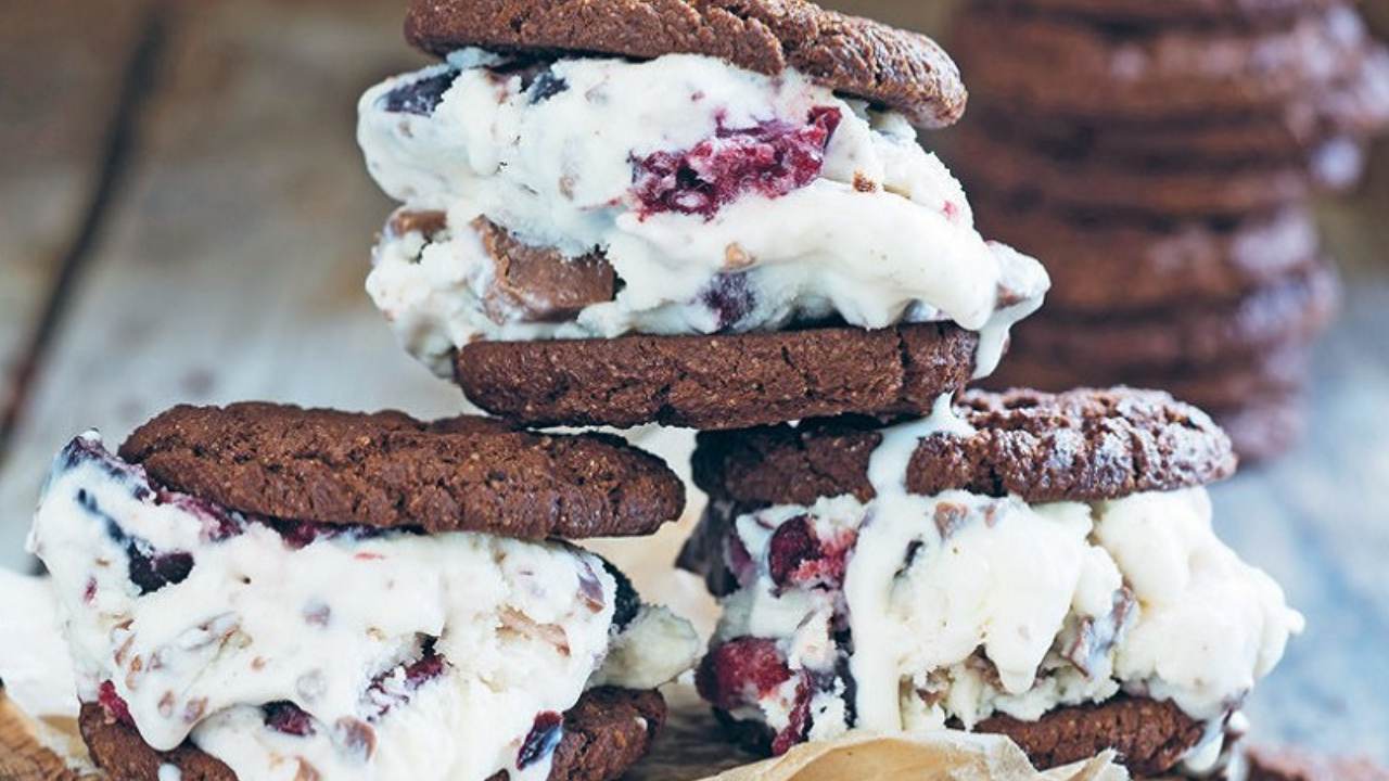 Cherry choc chip ice-cream sandwiches