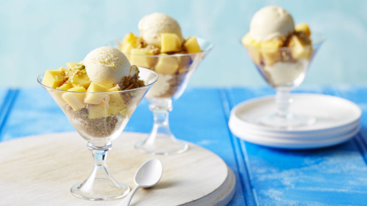 Relax with a calypso mango curd ice cream sundae