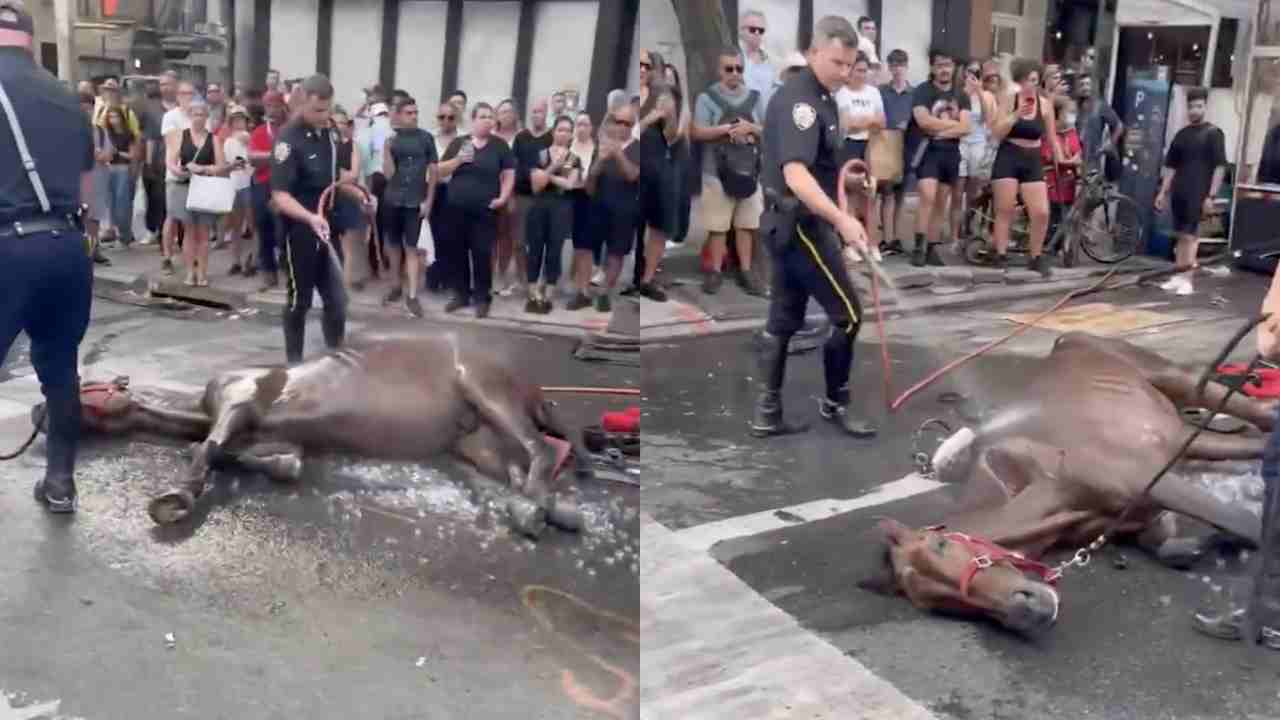 "Stop slapping him!": Carriage horse collapses in busy street