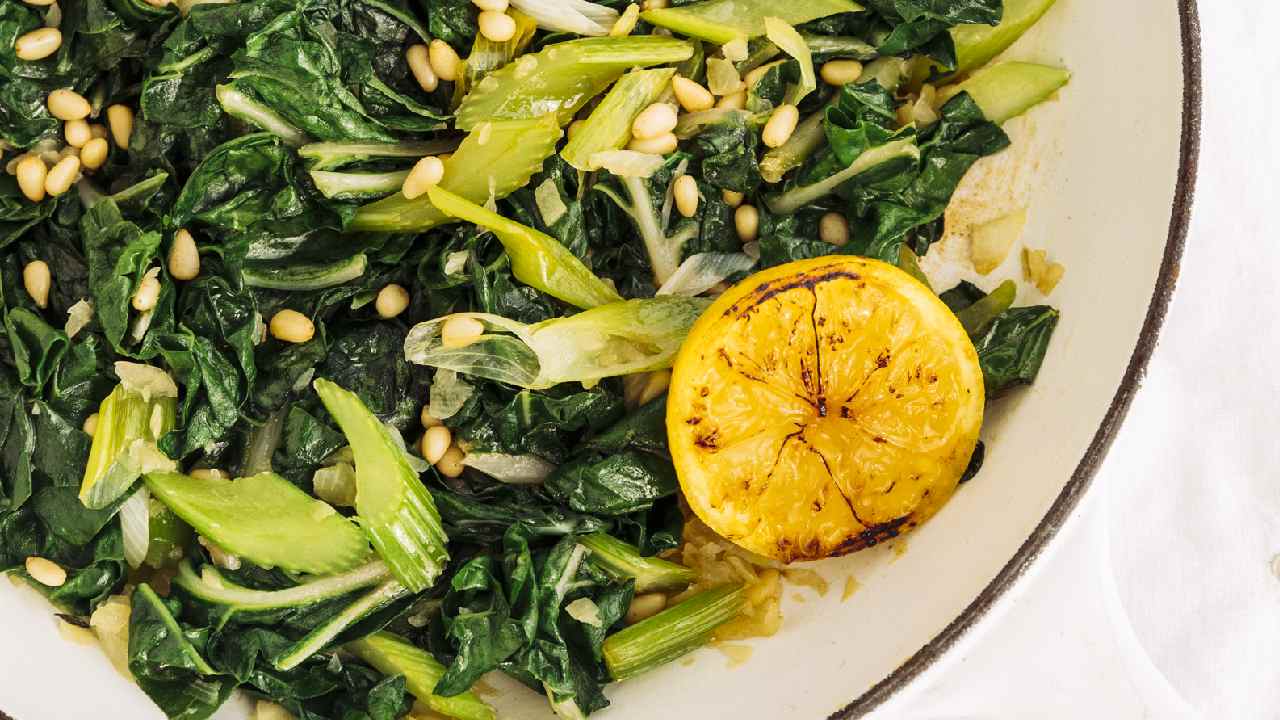 From a series of recipes designed by Xali: Sauteed silverbeet with celery and toasted pine nuts