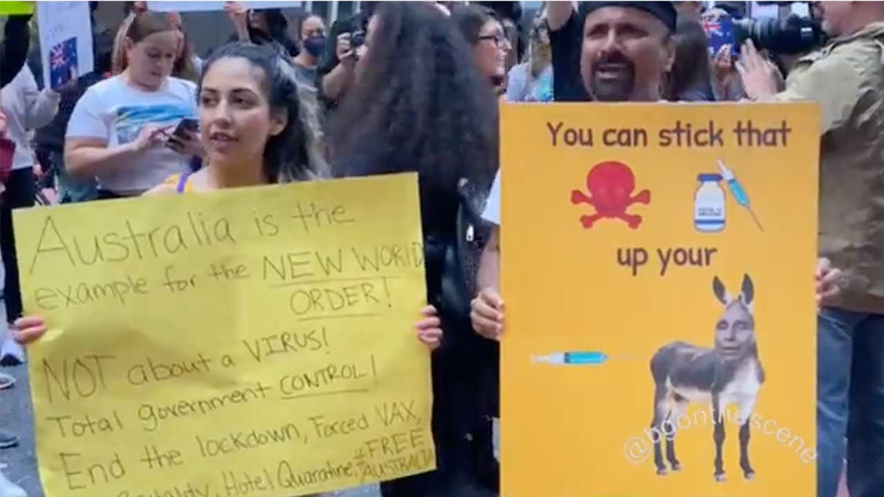 Anti-vaxxers in New York protest outside the Australian consulate