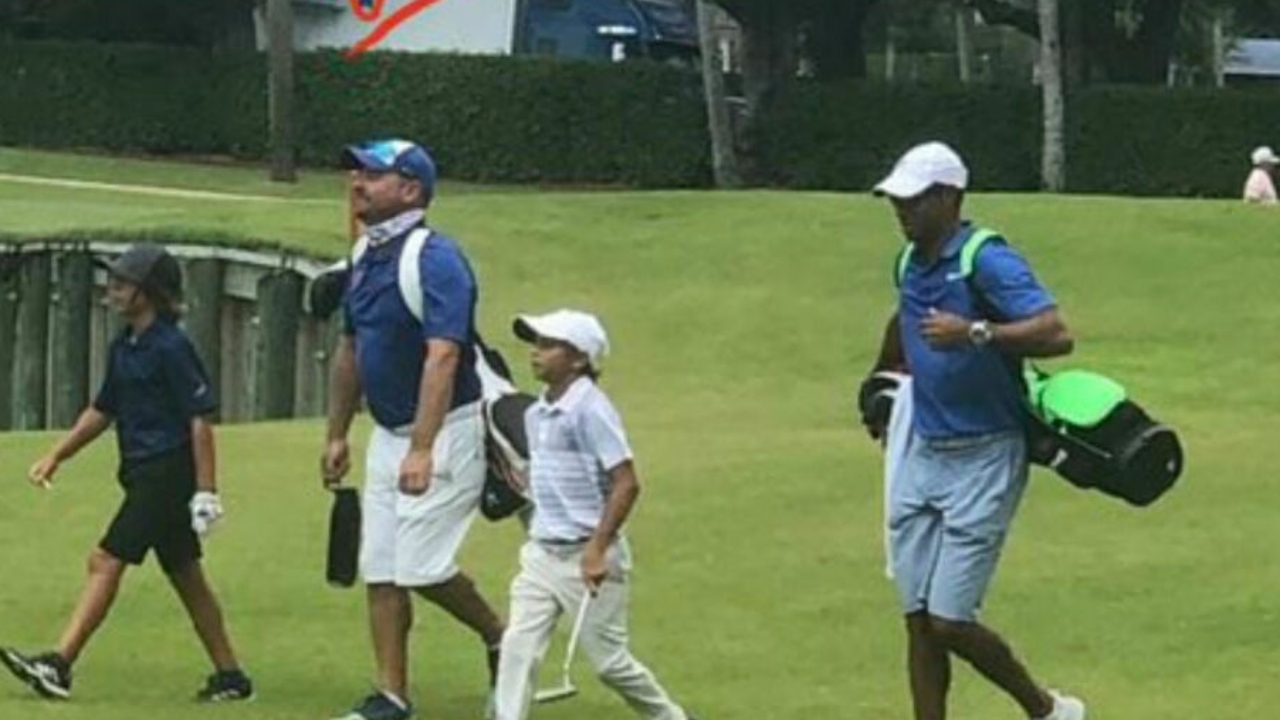 Golf fans go wild over shot of Tiger caddying for his son