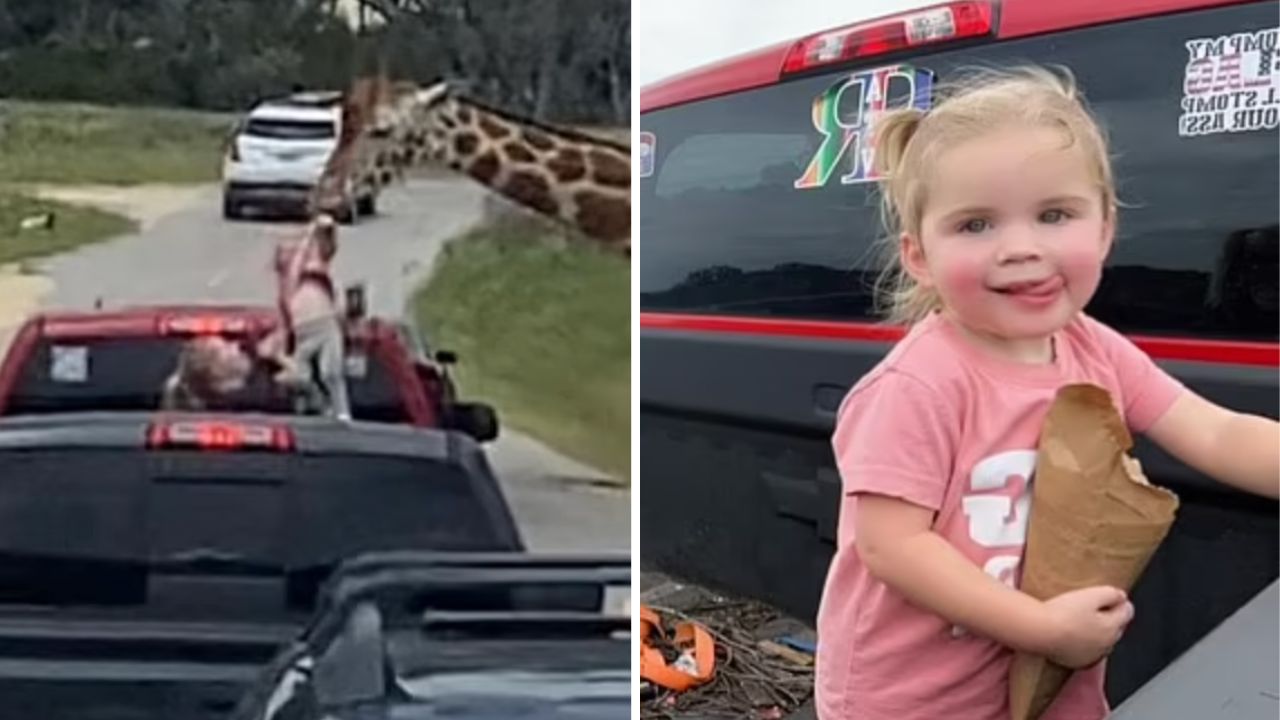 Wild moment giraffe snatches toddler from car
