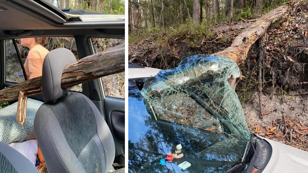 "She saw it and dodged it": Incredible scenes as tree plunges through seat in Schoolies crash